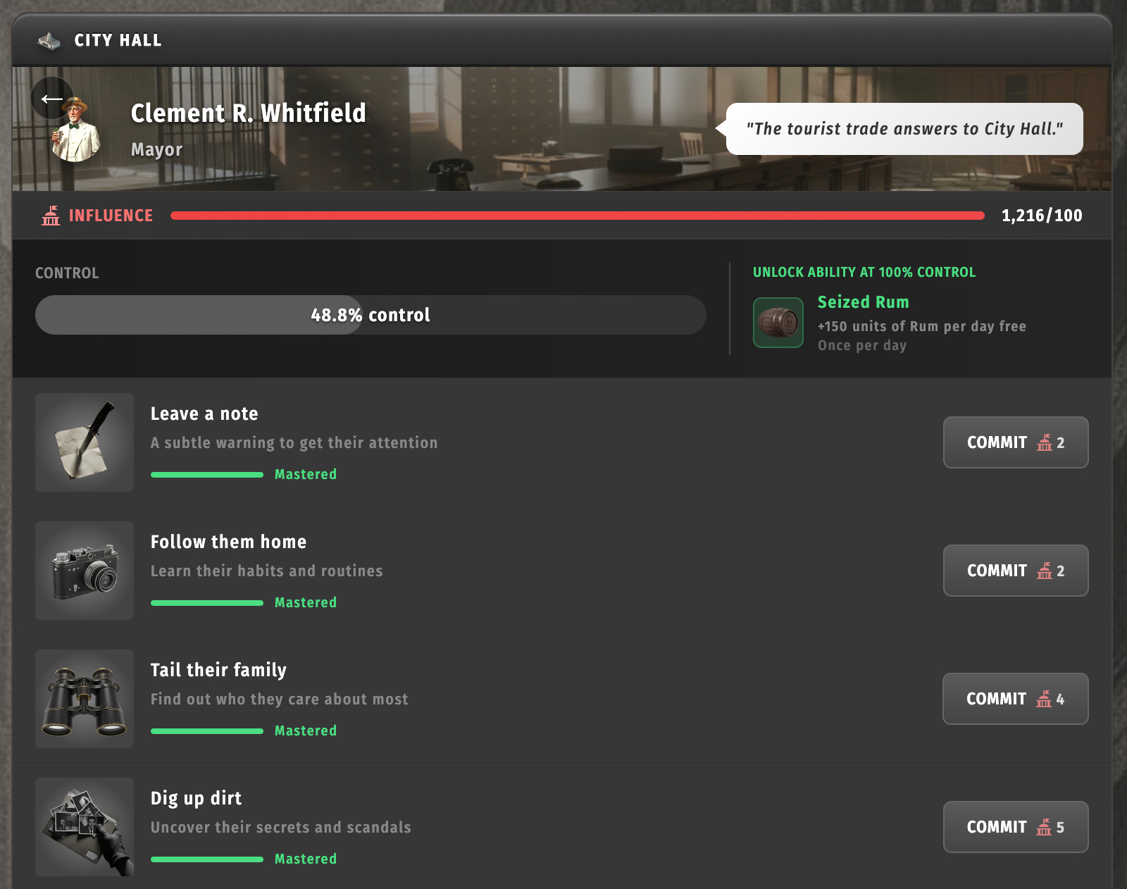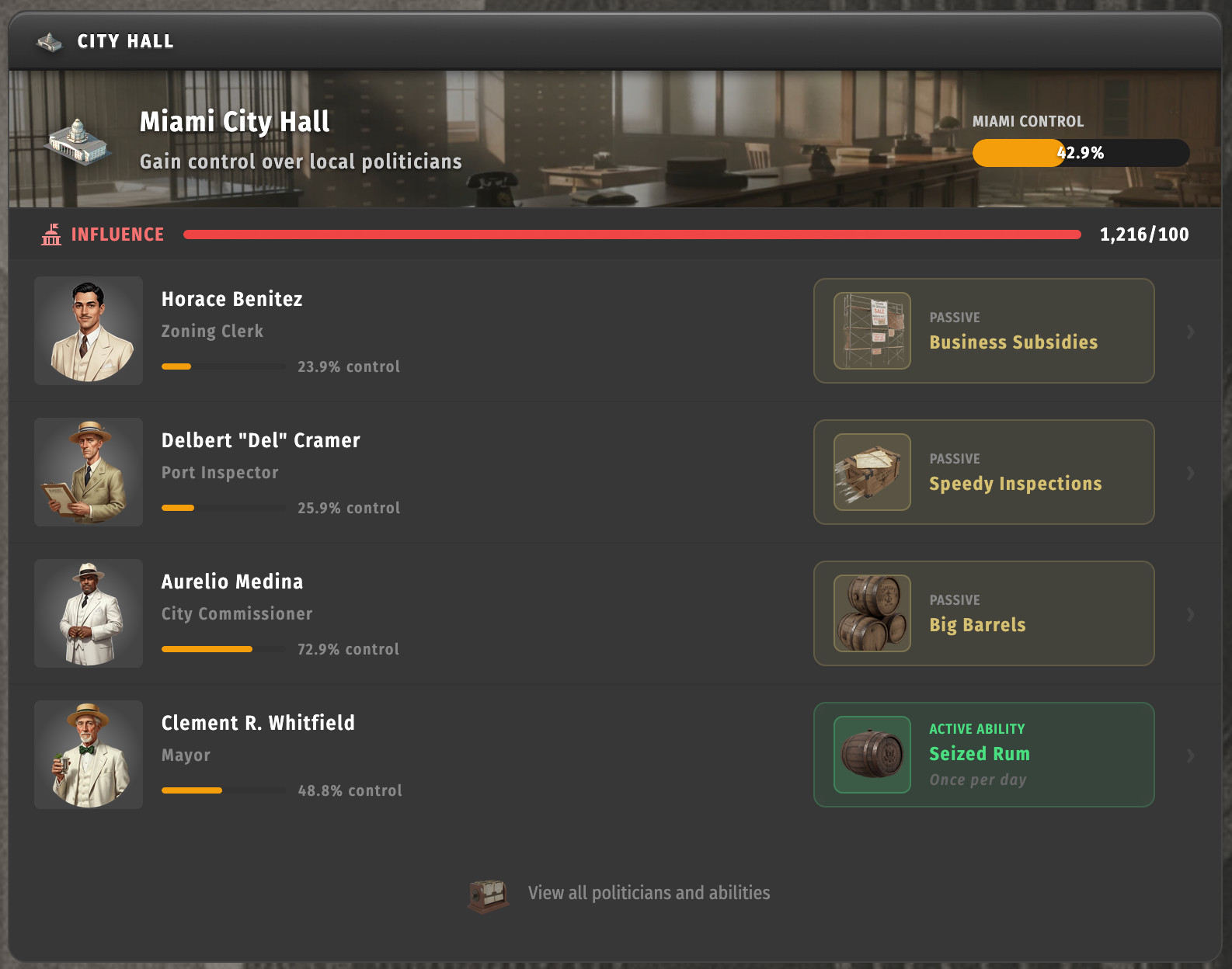 City Hall has been reimagined from the ground up, with specific politicians you can intimidate for account enhancements including passive and active abilities. These abilities augment other features by giving you extra earnings, faster production or other benefits.