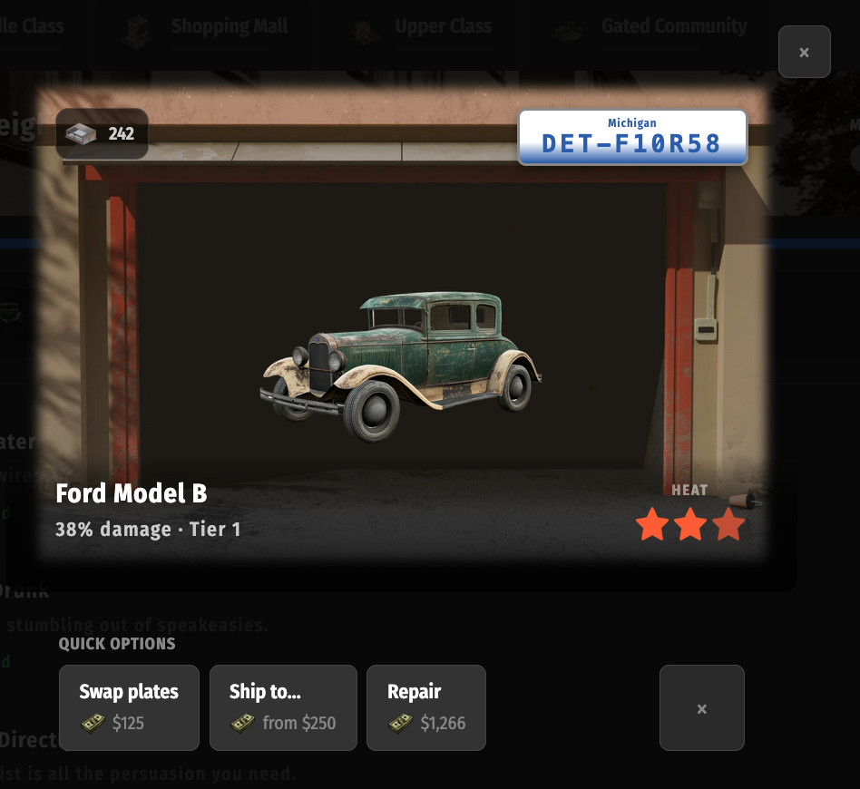A core part of Chicago Rum, we wanted to refresh Grand Theft Auto, revamp progression and make it far easier to use. All this is with the knowledge that cars become far more useful in CR 2.0 in both new features and new uses for existing features.